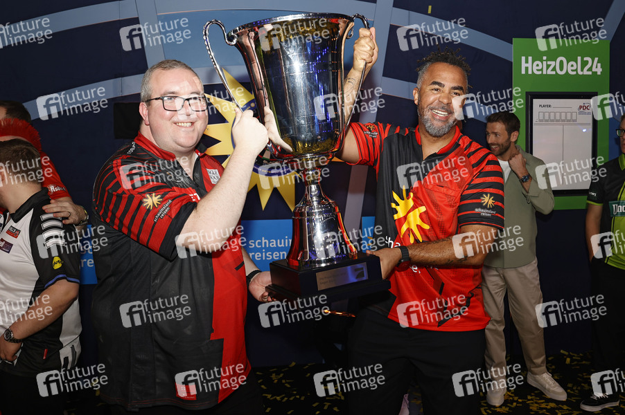 Stephen Bunting und Patrick Owomoyela bei der Promi-Darts-WM 2025 im Maritim Hotel. Düsseldorf, 05.01.2025