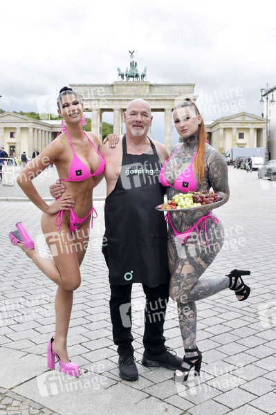 Micaela Schäfer, Egon Kowalski und Inked Lorena beim Fototermin zur Erotikmesse Venus Berlin 2025 am Brandenburger Tor. Berlin, 15.09.2025