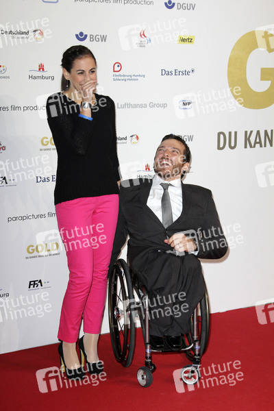 Kurt Fearnley mit Ehefrau Sheridan Fearnley bei der Premiere von 'Gold - Du kannst mehr als du denkst' im Hangar Nr. 6 der Lufthansa Technik. Hamburg, 26.02.2013