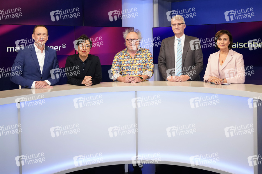 Stephan Stuchlik, Mariam Lau, Urban Priol, Elmar Theveßen und Sandra Maischberger in der ARD-Talkshow 'maischberger' im Studio Berlin Adlershof. Berlin, 24.04.2024