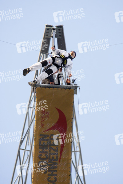 Base Flying von Jochen Schweizer mit den Hauptdarstellern von 'Gangs' auf dem Park Inn Hotel am Alexanderplatz in Berlin