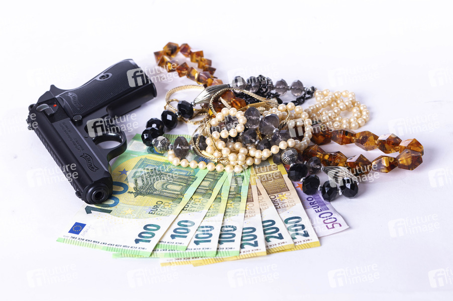 Überfall, Geld, Ersparnisse, Banknoten, Geldscheine, Vermögen, Euro, Geldschein, €, Einbruch, Einbrecher, Dieb, Diebstahl, Straftat, Waffe, Pistole, Walther PPK, Täter, Opfer, Raubstraftat, Raub, Ausrauben, Angriff, Schmuck, Symbolbild, Themenbild