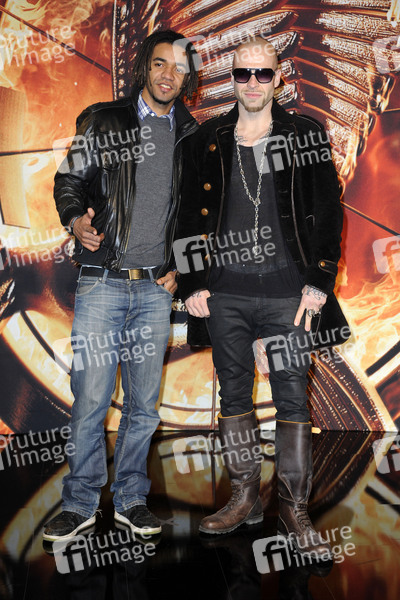 Johnny Strange und Mateo Itchyban Jaschik (Culcha Candela) bei der Filmpremiere von 'The Hunger Games: Catching Fire / Die Tribute von Panem - Catching Fire' im Cinestar im Sony Center am Potsdamer Platz. Berlin, 12.11.2013