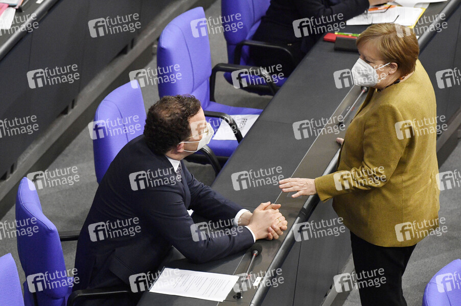 Jens Spahn und Angela Merkel in der 215. Sitzung des Deutschen Bundestages im Reichstagsgebäude. Berlin, 04.03.2021