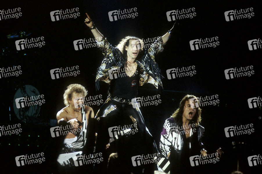 Rudolf Schenker, Klaus Meine und Matthias Jabs von den Scorpions live bei einem Konzert der 'Savage Amusement World Tour 88-90' im Hammersmith Odeon. London, 20.02.1989