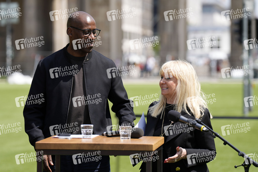 Joe Chialo und Iris Spranger bei der Pressekonferenz UEFA EURO 2024 - Fan Zone Berlin auf der Baustelle vor dem Brandenburger Tor / Straße des 17. Juni. Berlin, 21.05.2024