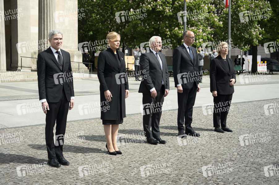 Stephan Harbarth, Julia Klöckner, Frank-Walter Steinmeier, Friedrich Merz und Anke Rehlinger bei der Kranzniederlegung mit den Repräsentantinnen und Repräsentanten der Verfassungsorgane des Bundes zum 80. Jahrestag des Endes des Zweiten Weltkrieges in Europa in der Neuen Wache. Berlin, 08.05.2025