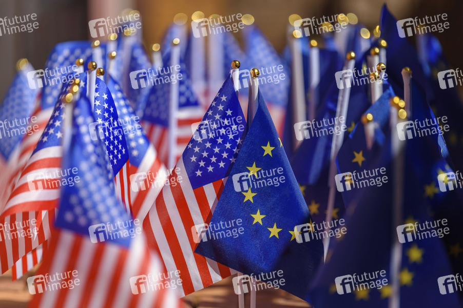 Flagge, Flaggen, Fahne, Fahnen, USA, US, EU, Europäische Union, EU-Flagge, EU-Flaggen, Europa, Euro, EU-Staaten, Handelspolitik, Zoll, Zölle, Handelsabkommen, Europapolitik, EU-Gesetze, EU-Politik, Mitgliedsstaaten, Demokratie, EU-Bürger, United States of America, Land, Staat, Nation, Länderranking, Länder-Ranking, Dollar, Freihandel, Country, Patriotismus, 4th of July, 4. Juli, Unabhängigkeitstag, Nationalfeiertag, Nationalstaat, Bundestaat, Bundesstaaten, Symbol, Heraldik, Nationalsymbol, Nationalfarben, Länderflagge, Nationalflagge, Protektionismus, Handelspolitik, Staatswesen, Nationalismus, Souveränität, Hoheitszeichen, Nationalstaatentum, Star-Spangled Banner, US-Politik, Autonomie, Unabhängigkeit, Diplomatie, Hoheitszeichen, Politik, Symbolbild, Symbolfoto