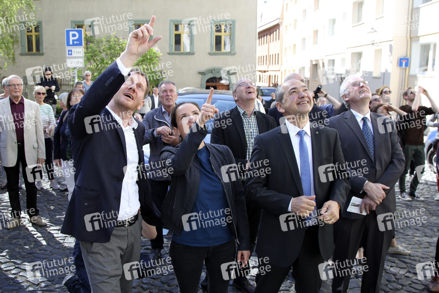 Michael Kretschmer, MadC und Rafal Gronicz bei der Enthüllung der Graffiti-Kunstwerke an den Türmen der Peterskirche. Görlitz, 25.04.2019