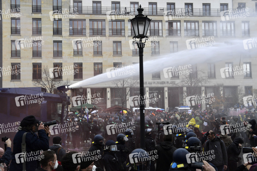 Tausende Demonstranten protestieren am Brandenburger Tor und im Regierungsviertel gegen die Corona-Politik der Regierung. Wegen der massenhaften Verstöße gegen die Hygieneauflagen hat die Polizei die Proteste unter Einsatz von Wasserwerfern beendet. Berlin, 18.11.2020