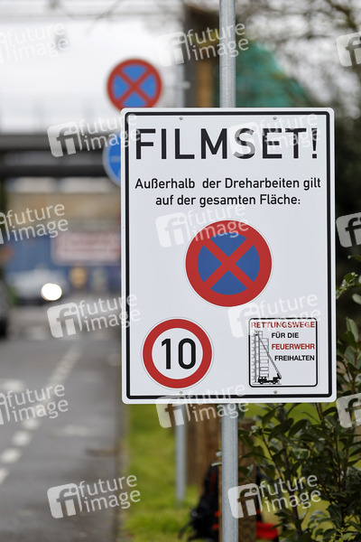 Ein Hinweisschild auf Dreharbeiten und Filmset der RTL TV-Serie 'Unter uns' in dem MMC Studios. (Themenbild, Symbolbild) Köln, 12.12.2020