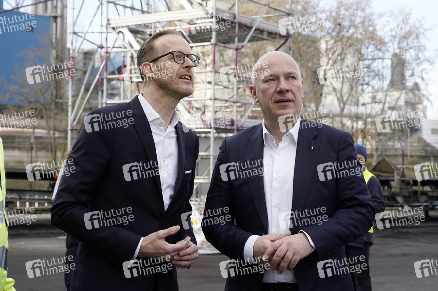 Christian Feuerherd und Kai Wegner bei der Grundsteinlegung einer Abwassergroßwärmepumpe von Vattenfall und Befüllen einer Zeitkapsel auf dem Kraftwerksgelände Reuter-West. Berlin, 12.03.2024