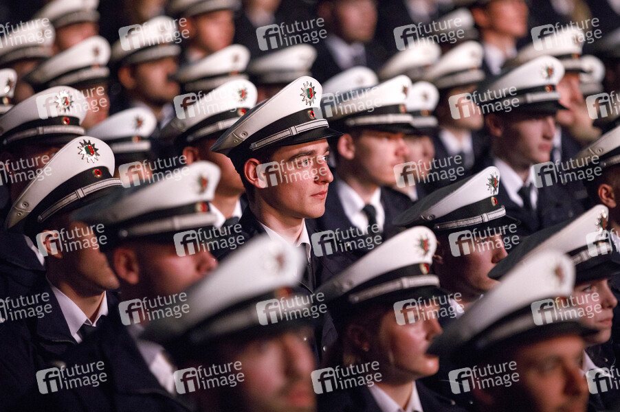 Vereidigung von neuen Kommissaranwärterinnen und Kommissaranwärtern samt traditionellem Mützenwurf in der Lanxess-Arena. Köln, 03.04.2019