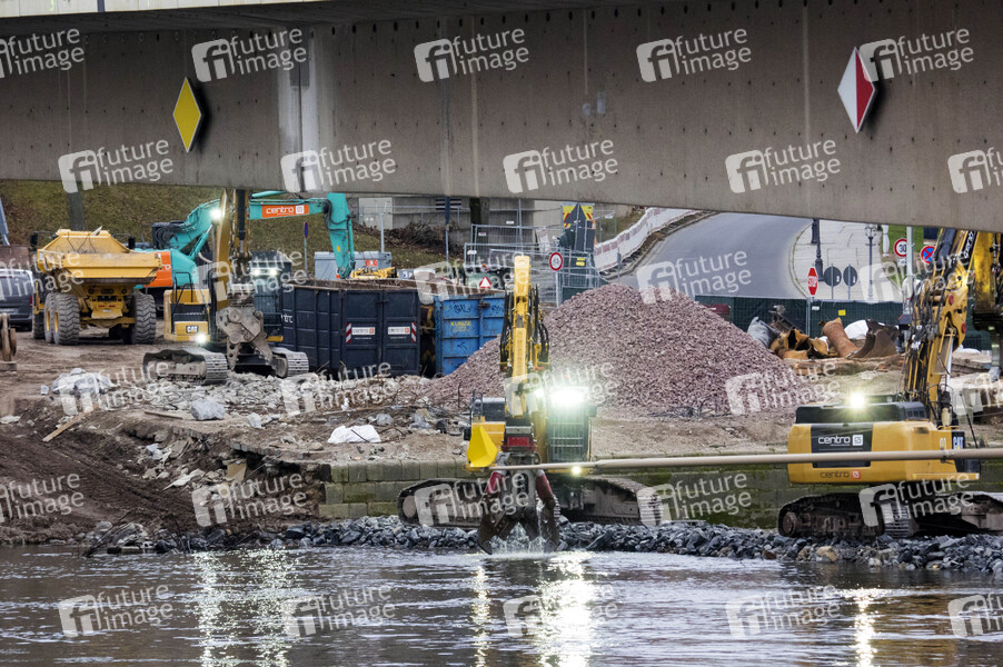 Straßenbrücke, Kulturdenkmal, Elbbrücke, Balkenbrücke, Spannbetonbrücke, Erbaut in den 1970er Jahren, Innere Altstadt, Innere Neustadt, Pirnaische Vorstadt, Carola von Wasa-Holstein-Gottorp, Namensgeber, Brücke, Einsturz, Elbe, Carolabrücke, Abriss, Brücke, Elbe, Bauarbeiten, Bagger