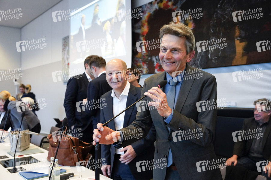 Olaf Scholz und Rolf Mützenich bei der Fraktionssitzung der SPD-Bundestagsfraktion im Reichstagsgebäude. Berlin, 15.10.2024
