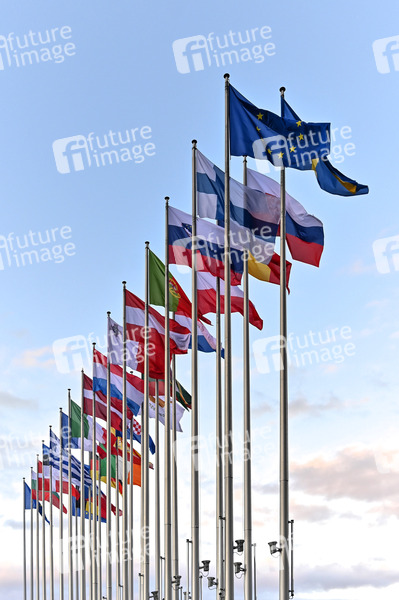 EU Parlament, Europäisches Parlament, EU Gebäude, Europäischen Union, EU Kommision, Europaflagge, Flagge, Fahne, Fahnen, Flaggen, Belgien, Deutschland, Frankreich, Italien, Luxemburg, Niederlande, Dänemark, Irland, Griechenland, Portugal, Spanien, Finnland, Österreich, Schweden, Estland, Lettland, Litauen, Malta, Polen, Slowakei, Slowenien, Tschechien, Ungarn, Zypern, Bulgarien, Rumänien, Kroatien, Symbolbild, Symbolfoto