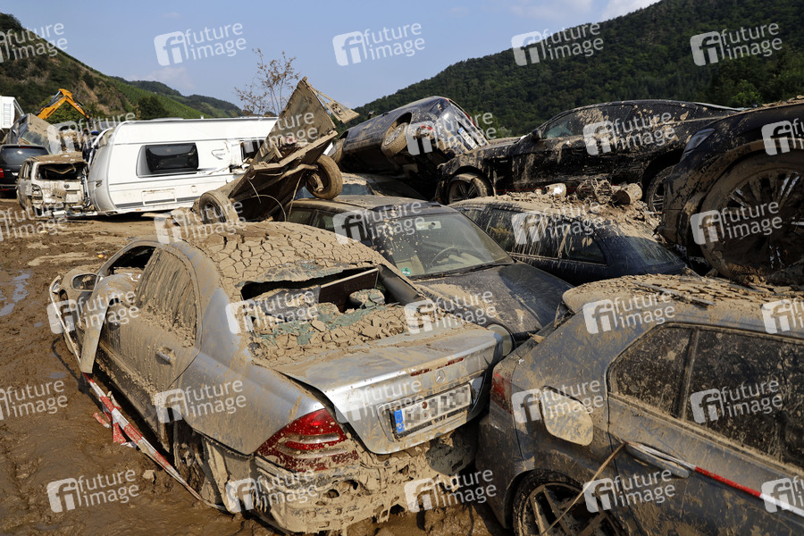 Nach dem Jahrhunderthochwasser in der Eifel durch heftige Regenfälle und Dauerregen mit Überschwemmungen und Überflutungen haben die Aufräumarbeiten im Ahrtal begonnen. Einheiten von Polizei, THW, Bundeswehr und Feuerwehr mitsamt vielen freiwilligen Helfern räumen Straßen, entfernen Schutt und Schlamm und versorgen die Menschen. Im Bild zerstörte Autos in der Ortschaft Dernau, in der die Flut viele Häuser zerstörte, 22.07.2021
