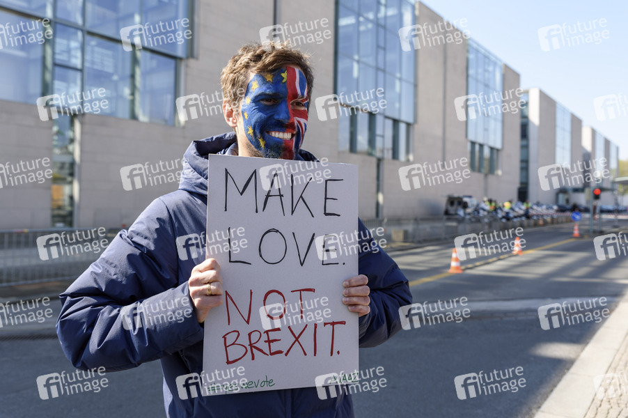 Demonstrant anlässlich des Besuchs der Premierministerin Theresa May im Bundeskanzleramt, um Fragen des Austritts Grossbritanniens aus der Europäischen Union zu erörten. Berlin, 09.04.2019