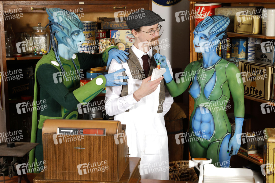 GEEK ART - Bodypainting and Transformaking: 'Aliens besuchen Einkaufsladen auf der Erde' mit Barbara und Enrico als Besucher und Collin als Verkäufer in einem Lebensmittelladen in den 1950er Jahren. Fotografiert im Dorfmuseum des Vereins Tundirum. Tündern, 07.06.2020 - Ein Projekt des Fotografen Tschiponnique Skupin und des Bodypainters und Transformakers Enrico Lein