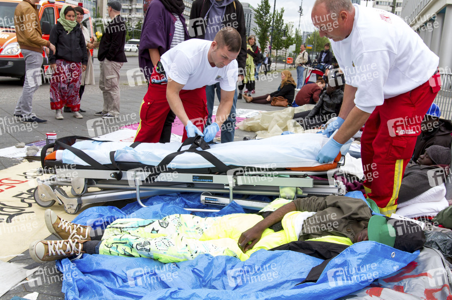 Ein Refugee wird von Sanitätern der Berliner Feuerwehr mit einem Rettungswagen ins Krankenhaus gebracht. Am Berlin Congress Center (bcc) befinden sich Flüchtlinge seit 6 Tagen im Hungerstreik. Sie fordern den Stopp aller Abschiebungen, dauerhafte Anerkennung des Aufenthaltes und die Aufhebung der Dublin-Verträge. Berlin, 08.05.2014
