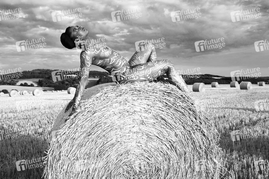Bodypainting, Erotik, Frau, Mädchen, Afrikanerien, nackt, draußen, weiblich, Körperkunst, Kunst, Ornamente, Malerei, Feld, Acker, Stoppelfeld, Heuballen, Stroh, Landwirtschaft, Ernte, Abendsonne, erotic, African woman, girl, nude, outdoor, female, body art, body painting, ornaments, field, hay, straw, farming, harvest, evening sun