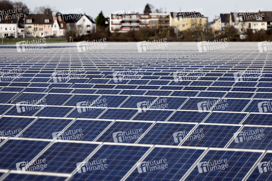 Der Solarpark Troisdorf Oberlar ist eine Fotovoltaik-Solarstromanlage der Stadtwerke Troisdorf und das größte Solar-Kraftwerk in NRW. Die Freilandanlage kann etwa 1000 Haushalte in der Region mit sauberem Solarstrom versorgen. Ein Stacheldrahtzaun umgibt das Gelände. Troisdorf, 12.02.2022