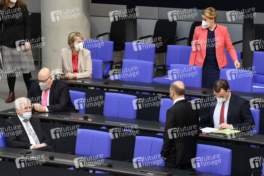 Horst Seehofer, Peter Altmaier, Anja Karliczek, Olaf Scholz, Franziska Giffey und Jens Spahn in der 223. Sitzung des Deutschen Bundestages im Reichstagsgebäude. Berlin, 21.04.2021