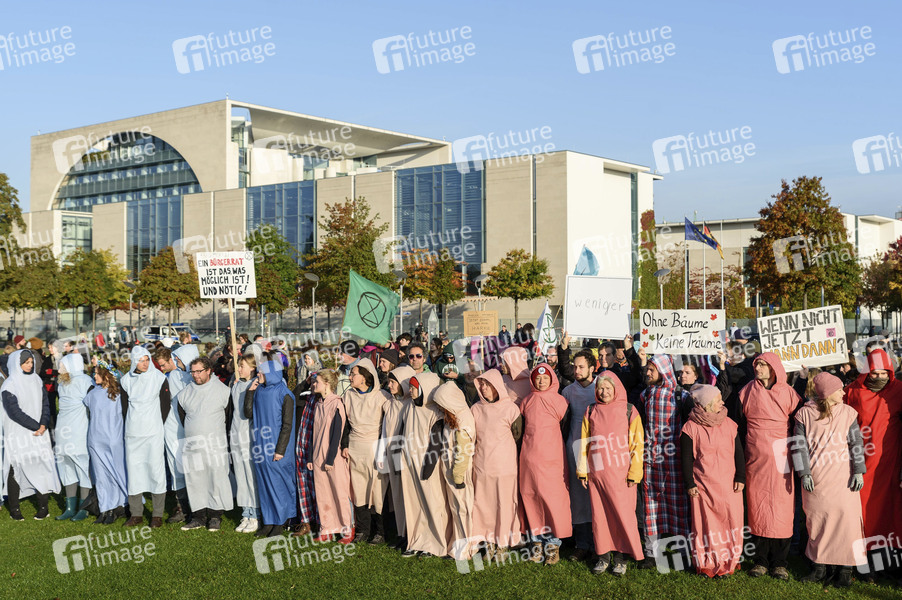 Aktivisten der Klimabewegung 'Extinction Rebellion' protestieren vor dem Bundeskabinett auf der Reichstagswiese. Berlin, 09.10.2019
