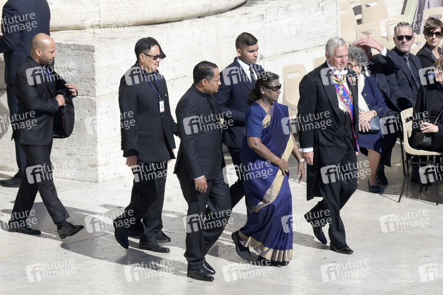 Draupadi Murmu bei der Trauermesse für den verstorbenen Papst Franziskus auf dem Petersplatz. Vatikanstadt, 26.04.2025
