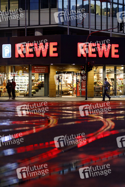 Leuchtreklame eines REWE-Supermarktes auf den Ringen. Köln, 29.09.2019