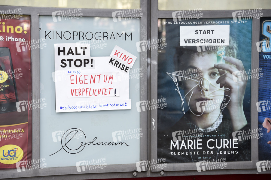 Protestaktion der Mitarbeiter gegen die geplante Schließung des Kinos Colosseum. Mit Aktionen wie dieser wollen die Mitarbeiter und Anwohner die Schließung verhindern. Ihrer Meinung nach wurde das Kino gezielt in den Ruin geführt. Die Betreiberfirma des Kinos hatte am 20. Mai Insolvenz angemeldet, begründet wurde das mit den Folgen der Coronakrise: Kinoverbot, ausbleibende Gäste, keine Einnahmen. Nun zeigt sich, dass wirtschaftliche Gründe infolge der ausbleibenden Einnahmen während der Corona-Krise nicht oder nur teilweise für die Schließung des geschichtsträchtigen Hauses verantwortlich sind. Finanzielle Corona-Unternehmenshilfen wurden nicht beantragt. Vielmehr haben sich Geschäftsführer Sammy Brauner und die Erbengemeinschaft des Nachlasses seines in 2019 verstorbenen Vaters Artur Brauner dazu entschlossen, das denkmalgeschützte Haus künftig nicht mehr als Kino fortzuführen. Vieles deutet darauf hin, dass Geschäftsführer Sammy Brauner und die Erbengemeinschaft Brauner andere, lukrativere Pläne für die Immobilie an dieser zentralen Stelle im Stadtteil Prenzlauer Berg verfolgen. Laut www.gleimviertel.de sei bereits im September 2019 ein Bauvorbescheid für das Grundstück Schönhauser Allee 123 beantragt worden. Inhalt des Bauvorhabens: Neubau und Überbauung des Grundstücks 'Colosseum' mit Büronutzung im Umfang von 15.960 m2 Gewerbefläche. Dieser Antrag sei positiv beschieden worden. Berlin, 21.06.2020