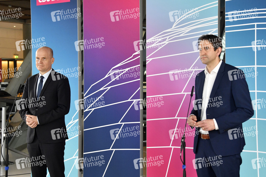 Ralph Brinkhaus und Andreas Jung bei einem Pressestatement der CDU/CSU-Bundestagsfraktion vor der Fraktionssitzung auf der Fraktionsebene im Reichstagsgebäude. Berlin, 04.05.2021