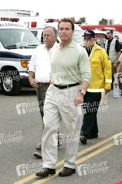 Gouverneur Arnold Schwarzenegger trifft sich mit Pressevertretern, Feuerwehrmännern und Opfern der Feuerkatastrophe an der Corral Canyon Road. Malibu, 27.11.2007