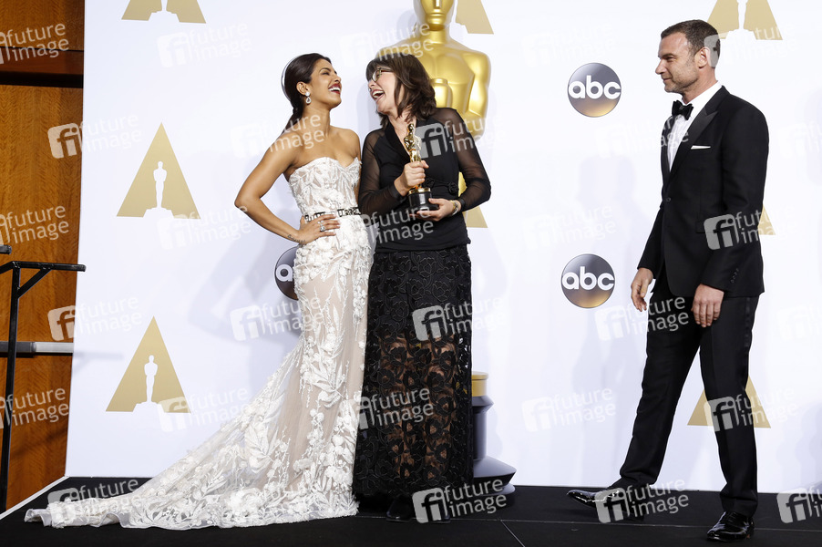 Priyanka Chopra, Margaret Sixel (Bester Schnitt bei 'Mad Max: Fury Road') und Liev Schreiber im Presseraum der Oscar Verleihung 2016 / 88th Academy Awards im Loews Hollywood Hotel. Los Angeles, 28.02.2016