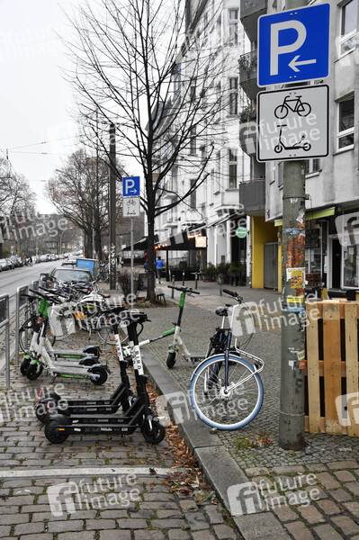 Parkraum für Fahrräder und E-Scooter am Rosenthaler Platz. (Themenbild, Symbolbild) Berlin, 09.01.2021