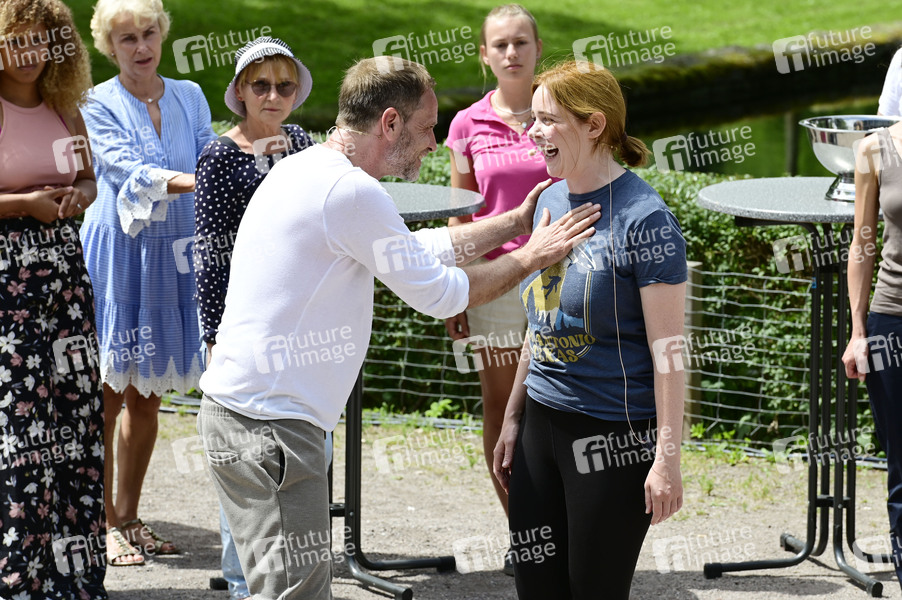 Julian Weigend und Olivia Marei bei der Fotoprobe zum Theaterstück 'Jedermann' am Pavillon im Weimarhallenpark. Weimar, 10.07.2024