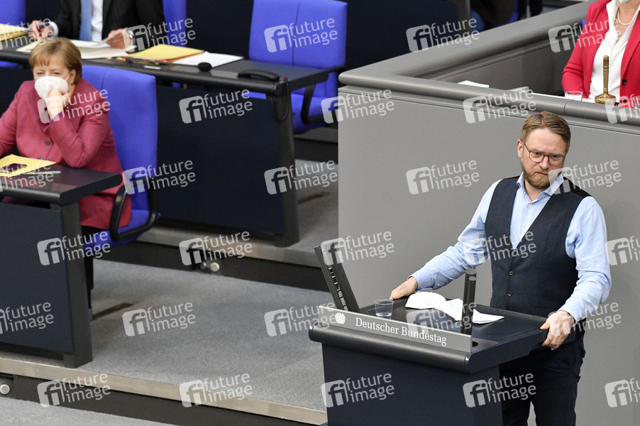 Angela Merkel und Jan Korte in der 223. Sitzung des Deutschen Bundestages im Reichstagsgebäude. Berlin, 21.04.2021
