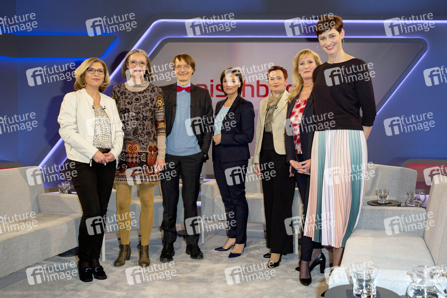 Oxana Giesbrecht, Ursula Hilpert-Mühlig, Karl Lauterbach, Sandra Maischberger, Jacqueline Klaus, Claudia Kleinert und Natalie Grams in der ARD-Talkshow 'Maischberger' im WDR Studio BS 3. Köln, 10.04.2019