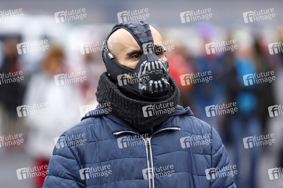 Bane, Bane-Maske, Querdenker, Querdenken, Demo, Demonstration, Rede, Corona, Coronaleugner, Corona-Maßnahmen, Verschwörungstheorien, Verschwörungstheoretiker, Regierungskritik, Regierungskritiker, Protest, Freidenken, Anti-Corona-Demo, Lock Down, Maskenpflicht, Mindestabstand, Corona-Demo, Corona-Demonstration, Querdenken-Demo, Hygienedemo, Initiative Querdenken, Pandemie, Protestaktion, Protestdemo, Protestdemonstration, Sars-CoV-2, Schutzmaßnahmen, Transparent, Versammlung, Verschwörungen, Corona, Virus, Coronavirus, Coronakrise, Karneval, Grundgesetz, Grundrechte, Freiheit, Maskenterror