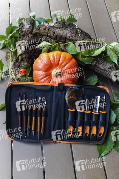 Kürbis schnitzen, Kürbisse, Cucurbita, Halloween, Herbst, Kürbisfruchtfleisch, Kürbiswände, Kürbis Gesicht, Kürbis-Schnitzset, Deko, Symbolbild, Themenbild