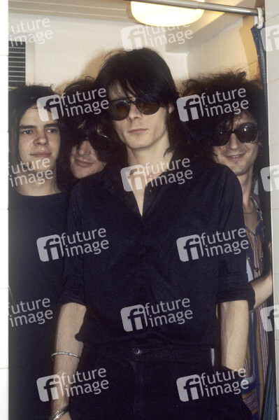 Craig Adams, Gary Marx, Andrew Eldritch und Wayne Hussey von The Sisters of Mercy bei einem Fototermin bei WEA Records. London, 18.06.1984
