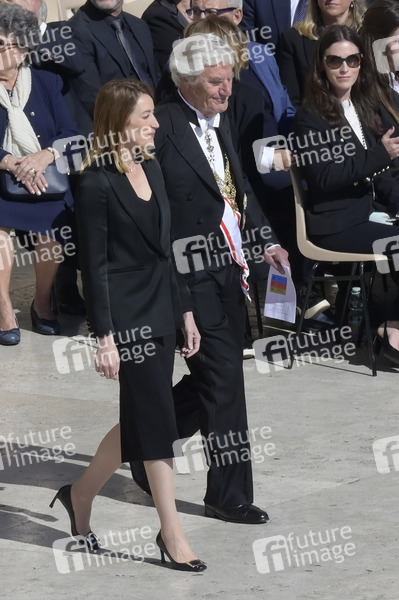 Roberta Metsola bei der Trauermesse für den verstorbenen Papst Franziskus auf dem Petersplatz. Vatikanstadt, 26.04.2025