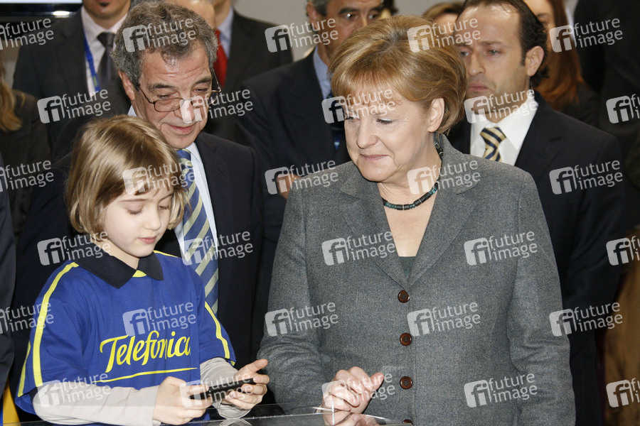 Eröffnungsrundgang von Bundeskanzlerin Merkel und Spaniens Ministerpräsident Zapatero auf der CeBIT 2010 (Centrum der Büro- und Informationstechnik), der weltgrößten Messe für Informations- und Computertechnik auf dem Messegelände in Hannover. Am Messestand von Telefonica.
