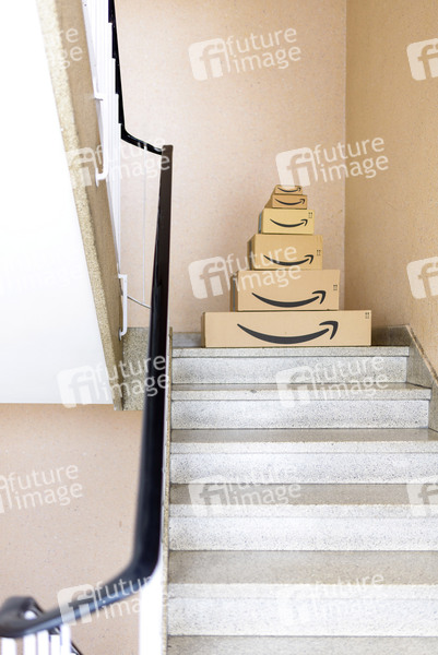 Abgestellte Amazon-Pakete in einem Treppenhaus - Einer der wenigen großen Gewinner der Coronakrise ist der Logistikriese Amazon. Die Gewerkschaft ver.di versucht seit April 2013, einen Tarifvertrag durchzusetzen, der die Löhne denen des Einzelhandels anpasst. (Sympoldbild, Themenbild) Nürnberg, 14.01.2021