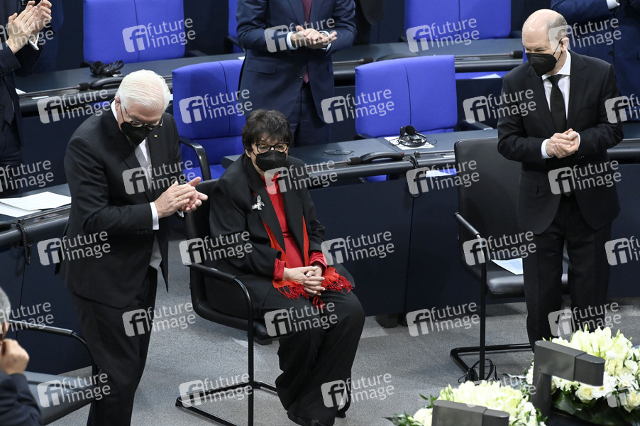 Frank-Walter Steinmeier, Inge Auerbacher und Olaf Scholz bei der Gedenkstunde zum Tag des Gedenkens an die Opfer des Nationalsozialismus anlässlich des Jahrestages der Befreiung des NS-Vernichtungslagers Auschwitz im Deutschen Bundestag im Reichstagsgebäude. Berlin, 27.01.2022