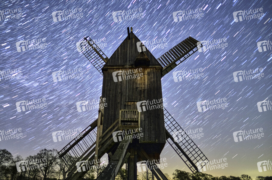 Sehenswürdigkeit, Sightseeing, Mühle, Windmühle, funktionsfähiges kulturhistorisches Denkmal, Ständermühle, Kastenmühle, Mühlenhaus, Hausbaum, technisches Bauwerk, Flügle, Windmühlenflügel, Windenergie, Energieumwandlung, Nacht, Sterne, Sternenhimmel