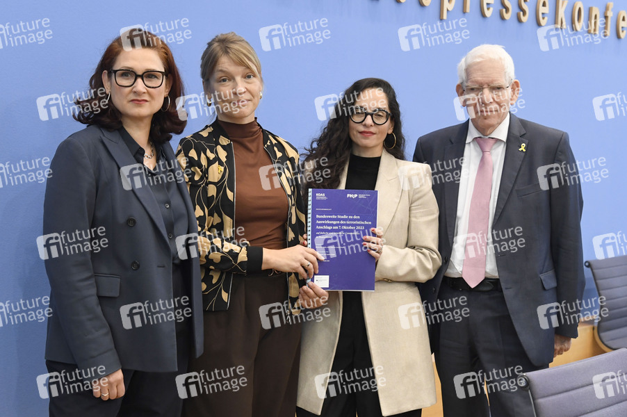 Ferda Ataman, Friederike Lorenz-Sinai, Marina Chernivsky und osef Schuster bei der Bundespressekonferenz zu den Ergebnissen des Forschungsprojekts 'Antisemitismus in Deutschland - Auswirkungen des 7. Oktober 2023' im Haus der Bundespressekonferenz. Berlin, 30.09.2025