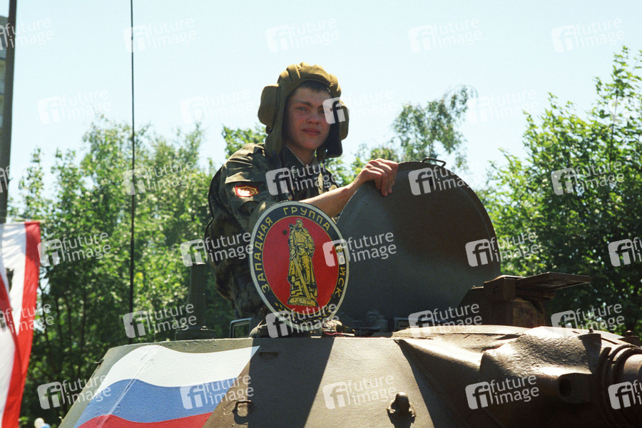 Russische Soldaten anlässlich der Abschiedsparade zur Verabschiedung der russischen Streitkräfte aus Deutschland in Schöneweide. Berlin, 25.06.1994