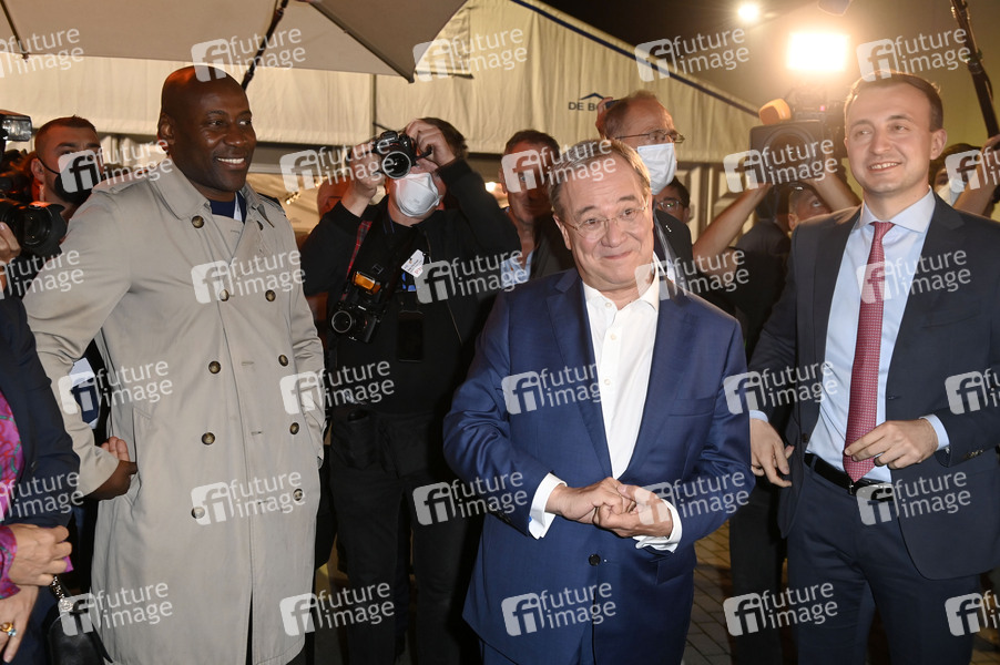 Joe Chialo, Armin Laschet und Paul Ziemiak beim 'Triell - Dreikampf ums Kanzleramt' von ARD und ZDF mit den Kanzlerkandidaten im Studio Berlin-Adlershof. Berlin, 12.09.2021