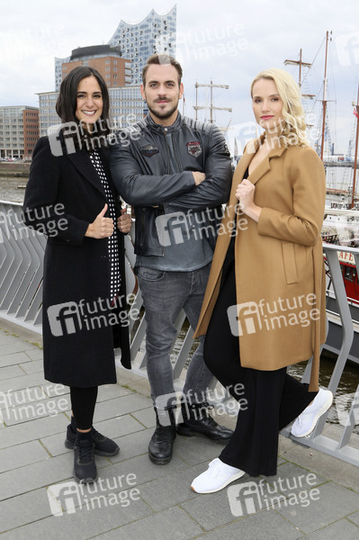 Aybi Era, Marc Barthel und Anna Hofbauer beim Fototermin am Set der ZDF TV-Serie 'Notruf Hafenkante - Die Pokerprinzessin' im City Sporthafen. Hamburg, 11.04.2019.